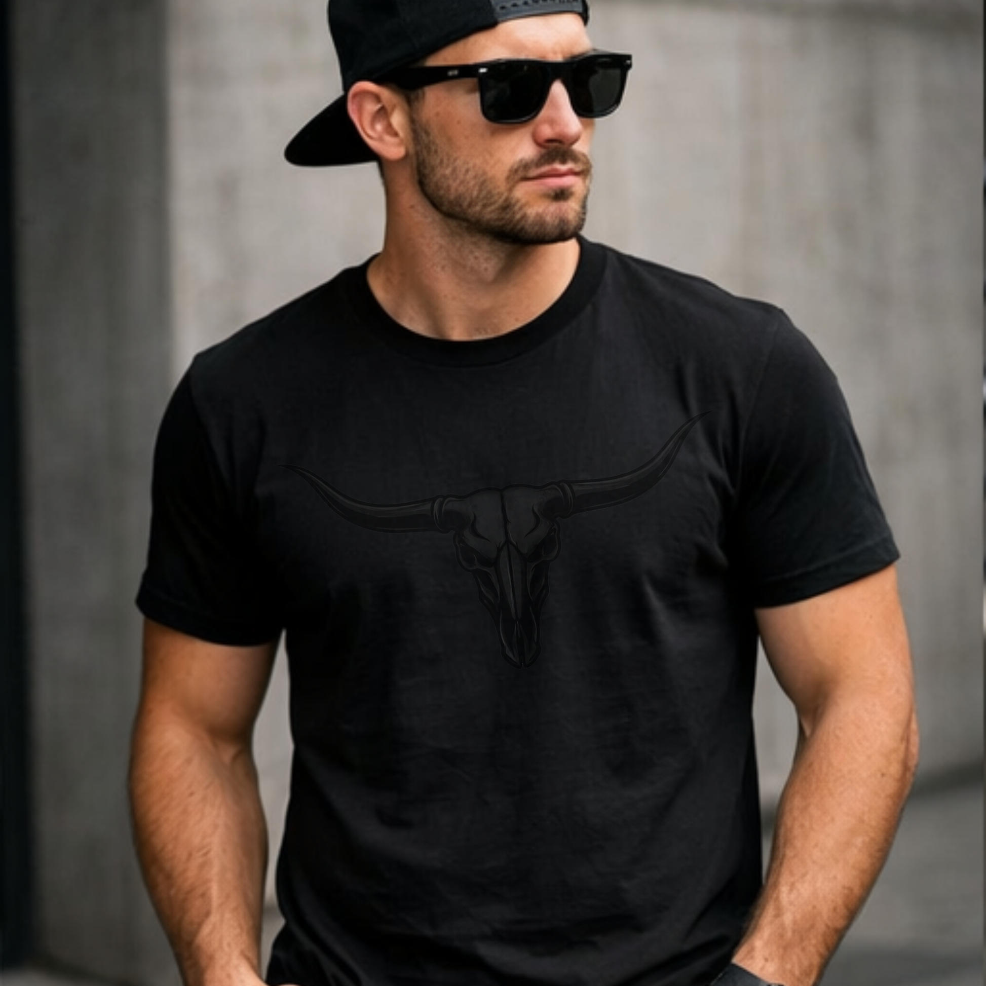 This black on black longhorn skull design is part of the Wild Reed Apparel Stealth Collection, created for those who prefer subtle detail over loud prints. The low contrast artwork blends into the fabric, revealing itself gradually in the light while maintaining a clean, minimal look from a distance.