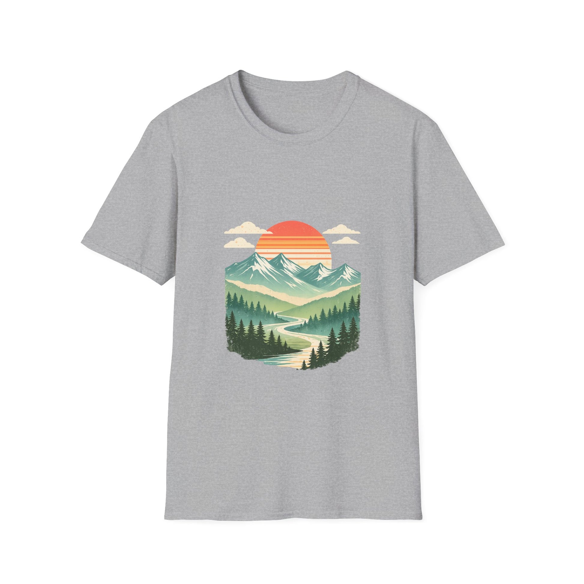 A lightweight, ring-spun cotton tee with a retro wilderness print that feels like an open road at dusk. The soft, smooth fabric drapes easily and keeps its shape thanks to ribbed knit at the collar and shoulder tape reinforcement. The back art — a sun sinking behind stylized mountains and a winding river through pine forests — invites slow afternoons, sunrise hikes, and evenings around a campfire. Wear it with worn jeans or a flannel for a layered, lived-in look that hints at quiet adventures and long drives into landscape light.